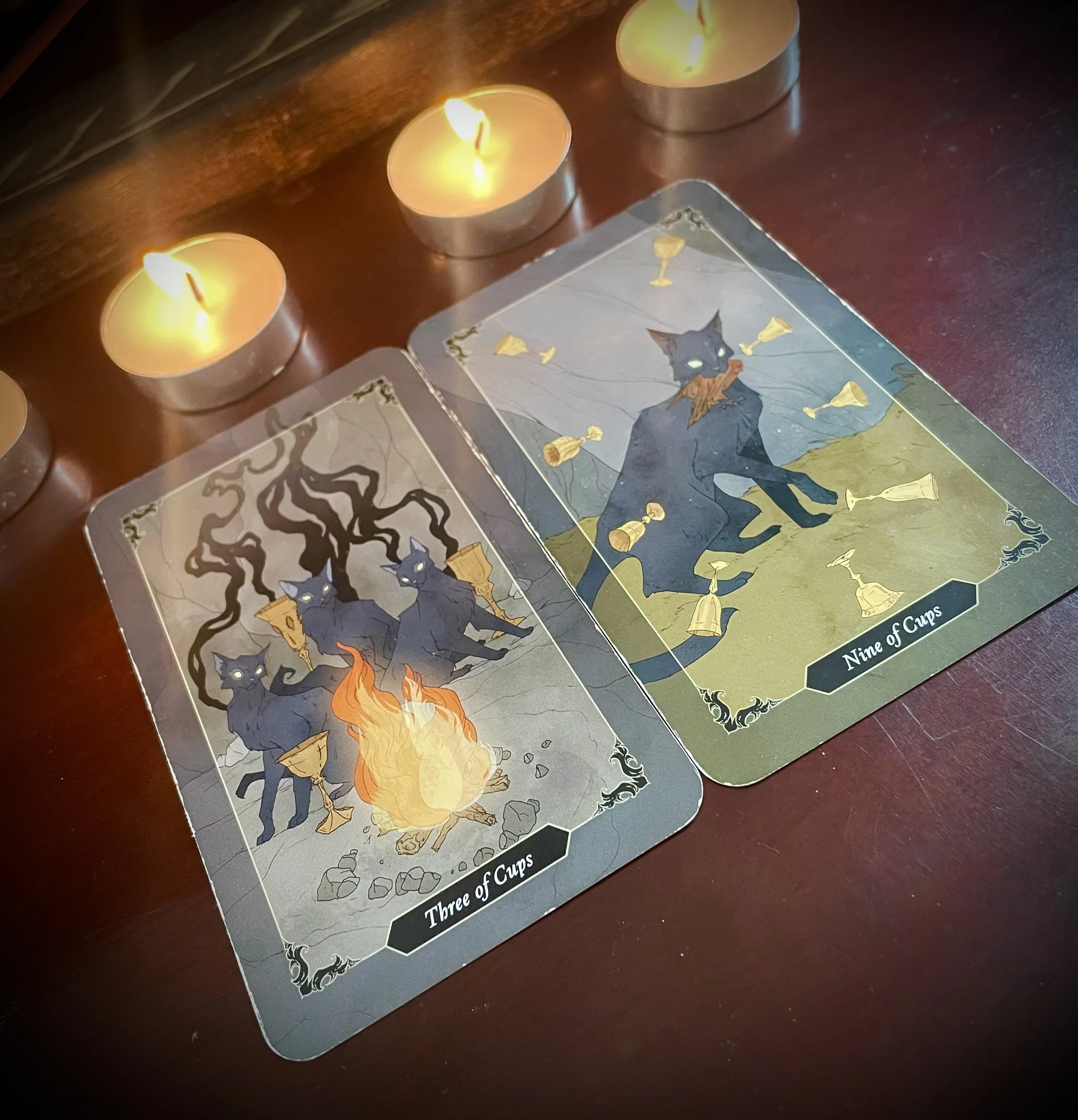 Look at how perfectly these cards fit together! All the magical cats! The nine of cups is a tasty treat, the reward for all the work we’ve done. Connecting with friends is the answer, It’s what allows our wish to come true. We get to have exactly what we want this time. It’s going to be even more delicious that we can imagine it. Life is about to get very sweet for a time. The sacrifices we made, the fights we fought, the planning and striving and work- all of it is designed to get us to this place! We will arrive here, before August is over. We will attain our goal, luck will come through, events will line up. Look for synchronicities and follow black cats, they are the symbol to carry with you this month.